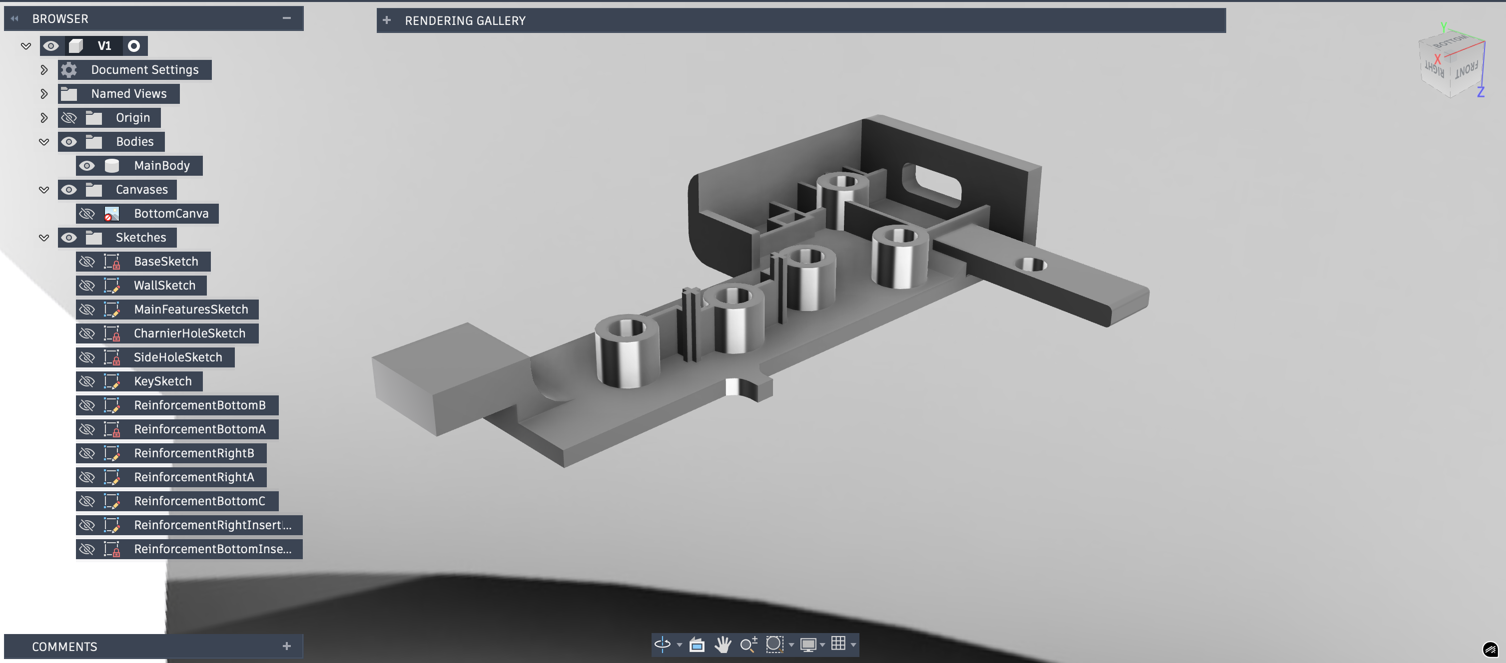 Le terrain étant prêt, j'ai commencé à prendre des mesures. Beaucoup de mesures. Il y avait deux grands sujets à traiter : d'abord la structure principale de la pièce, puis le positionnement des trous destinés aux inserts de vis. Le premier essai s'est révélé plutôt concluant. Je savais dès le départ que ce serait un processus itératif, donc j'ai naturellement appelé ce premier fichier "V1.stl". D'après vous, combien de versions a-t-il fallu pour que la pièce devienne enfin fonctionnelle ? Je suis donc passé à l'impression. La base tenait bien ; il restait surtout à aligner correctement les trous pour les inserts. Après une V2, puis une V3, les trous étaient au moins de la bonne taille et à peu près dans la bonne zone. Il était trop tard pour lancer une V4, alors j'ai laissé le patient sur la table d'opération pour la nuit.